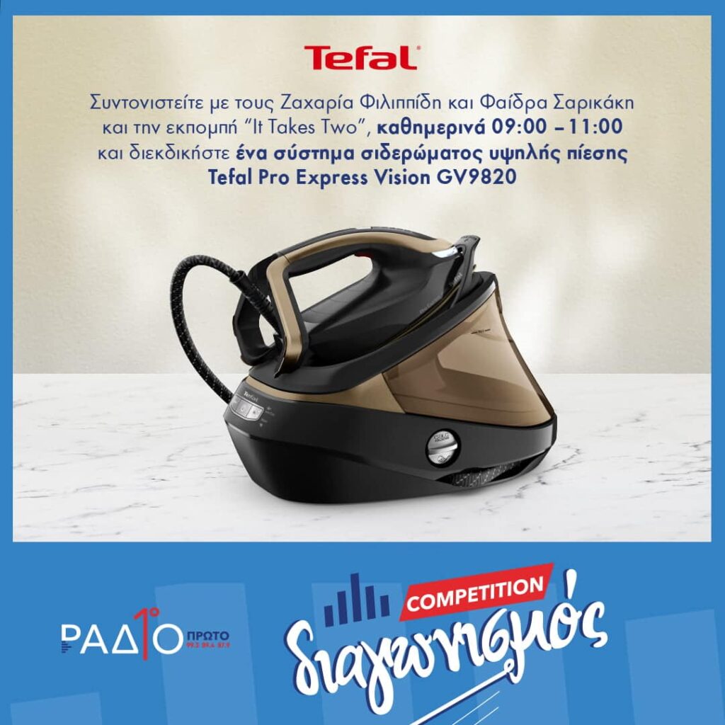 Η εκπομπή It Takes Two με τους Φαίδρα Σαρικάκη και Ζαχαρία Φιλιππίδη, καθημερινά 09:00 – 11:00 κληρώνει ένα TEFAL PRO EXPRESS VISION σύστημα σιδερώματος GV9820 αξίας 550 ευρώ από τη Δευτέρα 04 εως την Παρασκευή 15 Απριλίου. Οι ακορατές συμμετέχουν στον διαγωνισμό στέλνοντας TEFAL ΚΕΝΟ και το ονοματεπώνυμό τους δωρεάν μέσω viber στο 99990894.