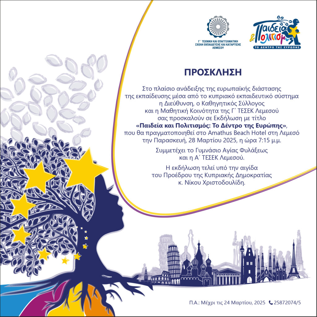 Eκδήλωση της Γ΄ ΤΕΣΕΚ Λεμεσού με τίτλο «Παιδεία και Πολιτισμός: Το Δέντρο της Ευρώπης», που θα διεξαχθεί στις 28 Μαρτίου, 2025 στο Ξενοδοχείο Amathus Beach Hotel στη Λεμεσό.